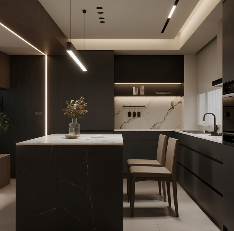 5 mm 超薄不銹鋼巖板復(fù)合背景墻,在 2700 K 燈帶下泛起綢緞般柔光。電視隱于滑軌,壁爐嵌入凹槽,金屬的冷冽與火焰的溫度,在一面墻上握手言和。